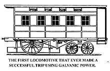 With these funds plus personal resources that took him into debt, Page built and tested the first full-sized electromagnetic locomotive, preceded only by the 1842 battery-powered model-sized Galvani of Scottish inventor Robert Davidson. Along the way, Page constructed a series of motors, revisions of the axial engine having different dimensions and mechanical features, which he tested thoroughly. The motor operated on large electrochemical cells, acid batteries having as electrodes zinc and costly platinum, with fragile clay diaphragms between the cells. Page's 1850 American Association for the Advancement of Science presentation about his progress impressed Joseph Henry, Benjamin Silliman and other leading scientists.[41]