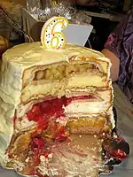 Phoenix is also popular for what he calls "The Charles Phoenix test kitchen" where he crafts decadent, exaggerated and occasionally grotesque novelty foods and desserts inspired by classic dishes from the past. Claiming to "put the kitsch in kitchen", Phoenix's recipes are largely based more on presentation rather than flavor; he admitted in a 2012 interview, "I'm a hack in the kitchen, I really am", noting elsewhere "This is not fine food, this is fun food!" which he encourages people to experiment with in their own kitchens.[19][20] His most famous creation is the Cherpumple, in which cherry, apple and pumpkin pies are baked into several different flavors of cake and then stacked together, a concoction which The Wall Street Journal dubbed "the turducken of desserts" and The Huffington Post described as "awesome and absolutely offensive all in one".[21][22]