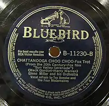"Chattanooga Choo Choo" is a 1941 song written by Mack Gordon and composed by Harry Warren. It was originally recorded as a big band/swing tune by Glenn Miller and His Orchestra and featured in the 1941 movie Sun Valley Serenade.[3] It was the first song to receive a gold record, presented by RCA Victor in 1942, for sales of 1.2 million copies.[4][5]