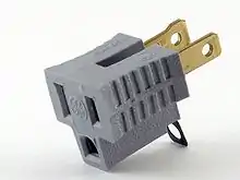 A cheater plug, AC ground lifter or three-prong/two-prong adapter is an adapter that allows a NEMA 5-15P grounding-type plug (three prongs) to connect to a NEMA 1-15R non-grounding receptacle (two slots).[1]: 112 They are needed to allow appliances with 3-wire power cords to plug into legacy ungrounded (two slot) receptacles found in older buildings. The use of such an adapter avoids the need to replace receptacles, but is potentially hazardous if the grounding tab is not connected to electrical ground.[2][3] These adapters are illegal in some jurisdictions, in particular throughout Canada.[4] A safer and more reliable alternative identified in the US and Canadian electrical codes is to replace the outlet with a Ground Fault Circuit Interrupter (GFCI) breaker outlet.[3]