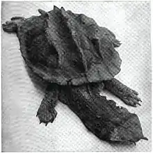The mata mata's brown or black, oblong carapace can measure up to 95 cm (37 in) at adult age.[14] The full adult weight is 21 kg (46 lb).[14] The mata mata's plastron is reduced, narrowed, hingeless, shortened towards the front, and deeply notched at the rear with narrow bridges.[13] These may be meant to allow the turtle to resemble a piece of bark, camouflaging it from possible predators.[15] The plastron and bridges are cream to yellow or brown.[13] The head, neck, tail, and limbs are grayish brown on adults.[13] The neck is longer than the vertebra under its carapace and is fringed with small skin flaps along both sides.[13] Hatchlings show a pink to reddish tinge in the underside edge of their carapaces and plastrons that gradually disappear as they grow.