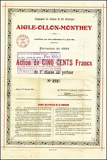 Share of the Compagnie du chemin de fer électrique Aigle-Ollon-Monthey, issued 1 February 1906