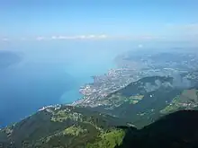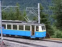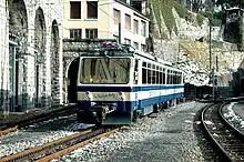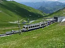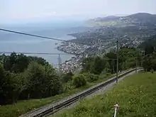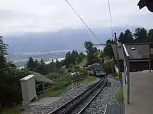 The Montreux–Glion–Rochers-de-Naye railway line is an electrically operated rack railway in Switzerland with a track gauge of 800 mm (2 ft 7+1⁄2 in). The line connects the resort of Montreux, on the shores of Lake Geneva, with the summit of the Rochers de Naye mountain. The line operates via the village of Glion, on the mountainside above Montreux, where it connects with the Territet–Glion funicular.[1]