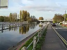 The left bank across and near Penton Hook Island is part of the clustered village of Laleham until Penton Hook Lock — a line of riverside houses with gardens. This is followed by Burway and Sir William Perkins School Rowing Clubs. From inland a humped road follows the river and Laleham Park to Chertsey Lock. In rowing, Burway Junior Regatta and Burway Head are annual races. An inlet along the upper left bank feeds around 200 million imperial gallons (910,000 m3) per day of water into the Queen Mary Reservoir.[5] Downstream the river is crossed by a bridge carrying the M3 motorway.