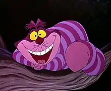 | Alice in Wonderland (1951) by Walt Disney Studios[24] | Animated film. Cheshire Cat voiced by Sterling Holloway. | ![]() | Mischievous, and takes pleasure in misdirecting Alice. He is able to dislocate his head from his body (does so in jest), but is also capable of invisibility, and frequently enters and exits the scene with all parts faded away except for his grin or eyes. | Thick build and a primarily pink coat with purple stripes. Wide smile and close-set, piercing yellow eyes. Character always depicted in good lighting with strong visibility, unlike other adaptations which obscure or shadow him |
