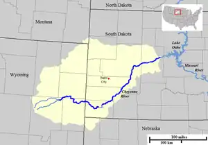 The Cheyenne River (Lakota: Wakpá Wašté; "Good River"[2]), also written Chyone,[3] referring to the Cheyenne people who once lived there,[4] is a tributary of the Missouri River in the U.S. states of Wyoming and South Dakota. It is approximately 295 miles (475 km) long and drains an area of 24,240 square miles (62,800 km2).[5] About 60% of the drainage basin is in South Dakota and almost all of the remainder is in Wyoming.[6]