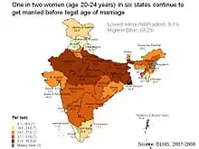 Child marriages are prevalent in India. Estimates vary widely between sources as to the extent and scale of child marriages. The International Center for Research on Women-UNICEF publications have estimated India's child marriage rate to be 47% from a sample surveys of 1998,[47] while the United Nations reports it to be 30% in 2005.[48] The Census of India has counted and reported married women by age, with proportion of females in child marriage falling in each 10 year census period since 1981. In its 2001 census report, India stated zero married girls below the age of 10, 1.4 million married girls out of 59.2 million girls aged 10–14, and 11.3 million married girls out of 46.3 million girls aged 15–19.[49] Times of India reported that 'since 2001, child marriage rates in India have fallen by 46% between 2005 and 2009.[50]Jharkhand is the state with highest child marriage rates in India (14.1%), while Kerala is the only state where child marriage rates have increased in recent years.[50][51] Jammu and Kashmir was reported to be the only state with lowest child marriage cases at 0.4% in 2009.[50] Rural rates of child marriages were three times higher than urban India rates in 2009.[50]