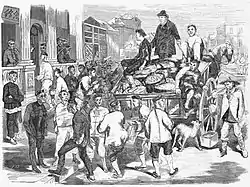 The Australian Gold Rushes are what first lured thousands of Chinese to the country. In 1855 in Melbourne there were 11,493 Chinese arrivals.[5] This was startling considering that barely five years previous, Melbourne's entire population had only been around 25,000 people. By 1858, 42,000 Chinese immigrants had arrived in Victoria, with many of them living in boarding houses in Little Bourke Street.[6] Due to the widespread racist sentiments in parliament and on the goldfields, the first of many immigration restrictions and Chinese targeting laws was passed in late 1855. However, due to the long, poorly regulated borders between the colonies of Australia the numbers of Chinese on the goldfields continued to swell. Upon the goldfields Chinese peoples faced many hardships. There were violent anti-Chinese riots; the Buckland Riot, the Lambing Flats Riots, as well as general discrimination and prejudice. However, there were many establishments in this period that would have a lasting effect on the history of Australia and the history of Chinese in Australia. One of these establishments were the Chinese camps, which most often, later, became Chinatowns in Australia. There was also the establishment and the consolidation of power for Chinese societies, many of these are still active in Australia today. These societies provided support and community for the Chinese in the colonies.