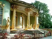The Chinese House (German: Chinesisches Haus) is a garden pavilion in Sanssouci Park in Potsdam, Germany. Frederick the Great had it built, about seven hundred metres southwest of the Sanssouci Summer Palace, to adorn his flower and vegetable garden. The garden architect was Johann Gottfried Büring, who between 1755 and 1764 designed the pavilion in the then-popular style of Chinoiserie, a mixture of ornamental rococo elements and parts of Chinese architecture.[1]