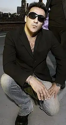 In 1982 Constantinou joined Adam Ant's live band as bass guitarist and backing vocalist in time for the Friend or Foe album tour and the video for the single Desperate But Not Serious.[5] He also took a minor acting role as Toulouse Lautrec in the video for Ant's 1983 single Strip.[6] Ant later pared down his eight-piece touring outfit to a four piece which first appeared on TV performances of Ant's UK top 5 single "Puss 'N Boots" in late 1983 before becoming a full time touring/recording unit in mid 1984. Under the pseudonym Chris De Niro, Constantinou became an integral part of the mid-1980s "Ant/Marco/Wiczling/De Niro" line up which recorded the UK Top 20 single "Apollo 9" and parent album Vive Le Rock, both of which were produced by Tony Visconti. Constantinou's performances in Ant's band included Top of the Pops, Saturday Night Live, American Bandstand and, on stage, Radio City Music Hall and 1985's Live Aid concert at Wembley Stadium. Parting with Ant in 1985, Constantinou spent time with SF Go, a Miles Copeland III-managed band he had formed with Danny Kustow (TRB, Glen Matlock).[2][7]