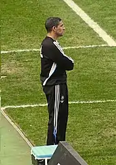 On 8 September 2008, Hughton was named caretaker manager of Newcastle following the departures of Keegan, Terry McDermott and Adam Sadler.[18] After a defeat to newly promoted, but in-form, Hull City[19] and a League Cup exit to Tottenham Hotspur[20] though, Hughton stood down as caretaker and was replaced on a temporary basis by Joe Kinnear.[21] Hughton was promoted to assistant manager after the Magpies appointed Colin Calderwood as first team coach on 26 January 2009. In February, Kinnear took ill before a game with West Bromwich Albion[22] and Hughton took charge of that game which Newcastle won 3–2.[23] In the week following the win, it was revealed that Kinnear needed a heart bypass operation and that Hughton along with Colin Calderwood and Paul Barron would have to take charge of the team for the next few weeks and possibly months. However, defeats to Bolton Wanderers,[24] Manchester United[25] and Arsenal,[26] and draws against Everton[27] and Hull City[28] resulted in Newcastle appointing Alan Shearer as interim manager until the end of the season.[29]