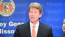 During the campaign, Koster's ex-wife Rebecca Bowman Nassikas donated $200,000 to Missourians for Honest Leadership, a political committee, which paid $187,500 to purchase air time and produce television ads in an effort to oppose Koster's candidacy for Missouri Attorney General.[25][26] He went on to defeat Republican State Senator Mike Gibbons in the general election, 52.83% to 47.17%.[27] He was sworn in as attorney general on January 12, 2009, succeeding Jay Nixon.[28][29]