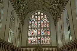 As with many Gothic church buildings, the interior of the quire was richly embellished.[19] William of Malmesbury wrote: "Nothing like it could be seen in England either for the light of its glass windows, the gleaming of its marble pavements, or the many-coloured paintings which led the eyes to the paneled ceiling above."[19]