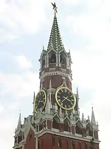 When Mikhail Fyodorovich wished to see clocks on the Spassky Tower with more difficult mechanics as before, Galloway agreed and, because of the clocks' placement, also recommended to overbuild a high tower with a thatched roof over the gates, which was done from 1624 to 1625. When the work was finished and the bells controlled the clocks' time, Galloway received on 29 January 1626 from the Tsar and His father, Patriarch Philaret Nikitich, salary of one silver cube, 10 arshin scarlet satin, 10 arshin azure damask, 5 arshin amber-coloured taffeta, 4 arshin raspberry-coloured stuff, forty sables for 41 rubles, forty martens for 12 rubles; altogether cost about 100 rubles. "The Tsar presented him all this for constructing the tower and clocks over the Frolovsky gates in the Kremlin".[4] In May that same year a heavy fire destroyed the clocks; Galloway restarted the work and finished in 1628; on 16 August 1628 he received almost the same presents as before.[4]