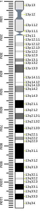 - "Search results - 13[CHR] AND "Homo sapiens"[Organism] AND ("genetype protein coding"[Properties] AND alive[prop]) - Gene". NCBI. 2017-05-19. Retrieved 2017-05-20.