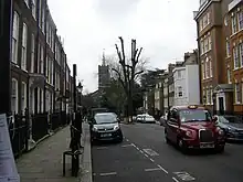 A line of trees runs down the middle of the street. The trees have been present since at least the development of the south side of the street in the 1720s. Six lime trees were planted in the mid 19th century, of which only one still stands, at the furthest end from the church. The present trees were planted in the 1970s, and are maintained by the London Borough of Camden.[5]