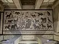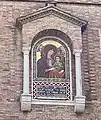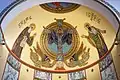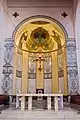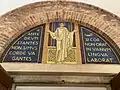The area of the Sant'Anselmo complex open to the general public is the church which was consecrated on November 11, 1900. The church was consecrated by Cardinal Mariano Rampolla del Tindaro, assisted by twelve cardinals, sixteen archbishops and bishops, fifty-two abbots, rectors of all the major colleges of Rome, superiors general of the major religious orders, and all ambassadors accredited to the Holy See.[6] It is constructed of three naves, divided by granite columns, and includes one main altar and two side altars. The ceiling is a truss and the crypt was made of five naves with sixteen side altars. In 1952 there was a renovation of the church interior by architect Fritz Metsger. This saw the construction of elevated choir stalls for the monks in the transepts, the addition of an altar under the arch that allowed the priest to face either direction in celebrating mass, and the creation of three main mosaics by the German monk Radbodus Commandeur. The mosaics are located above the two side altars, as well as above the main apse which depicts the jeweled cross between angels and Saints Benedict and Anselm. Commandeur also completed the mosaic under the main altar covering the reliquary containing the relics of Saint Alexander of Rome. He also produced numerous pieces within the monastic enclosure of the College as seen in the gallery of photos below.[7] The paschal candle stick is modern but in the Cosmatesque style. The lower level has now been converted to the use of the library for the University. In the courtyard of the atrium, there is a bronze statue of Saint Anselm made in 1966 by Swiss sculptor Albert Wider from Widnau. From here, it is possible to see Santa Maria del Priorato of the Knights of Malta, which lies in an adjacent complex that is closed to the public. In the entrance to the Sant'Anselmo complex, reached from the atrium, is a Roman Orpheus mosaic from a second-third century home that was found during construction.[8][9]