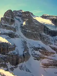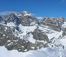 Cima Brenta is the highest[2] mountain in the Brenta group (It.: Dolomiti di Brenta), a subgroup of the Rhaetian Alps in the Italian Region of Trentino-Alto Adige, with a reported height of 3,150 metres (10,330 ft).[3] The mountain rises imposingly up between the rock towers and pinnacles of the central Brenta Group. A sharp ridge connects the mountain on its southern side to the Spallone die Massodi. The northern ridge steeply descends towards Bocca del Tuckett. Towards north west a slender couloir descends all the way from the top towards the Vedretta di Brenta Inferiore, the mountain's 'lower' glacier. Large shouldering formations extend towards the west, culminating in the Cima Mandrone and the Punti di Campiglio, and northwest, culminating in the Cima Massari. Above these formations a glacier, the Vedretta di Brenta Superiore, the 'upper' glacier descends the mountain, being cut off by a vertical precipice over the Vedretta di Brenta Inferiore. On the eastern side the mountain rises up with an imposing 700-meter high vertical rock face with on its left side a distinct orange-like color. Above this lies a horizontal ledge, the Cengia Garbari, on which the Via delle Bocchette Alte proceeds. The actual mountain has two summits that are some 250 meters apart, of which the eastern top reaches the highest altitude. The glaciers, vedrette, have been shrinking steadily over the last decades as a result of climate change. The historical name Cima Brenta was not always as evident as it is today. The toponymy of these parts was largely established by Nepomuceno Bolognini.[4] The mountain, somehow, became a place where nationalistic sentiments were demonstrated. In 1889 the Austro-Hungarian authorities decided to rename the mountain to Kaiser Franz Josef-Spitze.[5] The name never caught on -not even in German literature.[6] When the occasion occurred to raise a large yellow-black imperial flag on the summit,[7] fully visible from Val Rendena as well as from Molveno, local guide Giuseppe 'Bepaccia' Zeni and some companions climbed the mountain to take it down. In 1912, on the other hand, the Italian flag was hoisted by irredentists on Cima Brenta, deliberately just before the first snow fall, so that the flag remained visible until the next summer.[8] Around 1953 electricity company SISM, predecessor of ENEL proposed to build a cable car trajectory from Molveno to the top of Cima Brenta.[9] The plans were abandoned and in 1967 the mountain became protected as part of the Parco Naturale Adamello-Brenta.