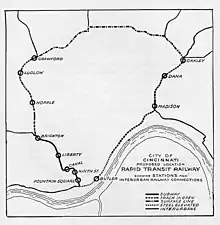 In 1910, Henry Thomas Hunt spearheaded plans for a new rapid transit system.[9] The next year, City Council convinced the Ohio State Legislature to lease the city's portion of the canal for use as a boulevard and subway system.[3] The city hired experts who had worked on Boston's and Chicago's rapid transit systems to research the best possible implementation for Cincinnati's rapid transit system.[10] The result were four "Schemes", or proposed routes. The chosen plan—Scheme IV, modification H—looped around the city hitting the central suburbs of St. Bernard and Norwood, the eastern suburbs of Oakley and Hyde Park, and then returned into downtown.[10]