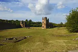 The Circus itself is the best preserved in the area of Rome, and is second only in size to the Circus Maximus in Rome.[2] The only games recorded at the circus were its inaugural ones and these are generally thought to have been funerary in character.[3] They would have been held in honour of Maxentius' son Valerius Romulus, who died in AD 309 at a very young age and who was probably interred in the adjacent cylindrical tomb (tomb of Romulus). The imperial box (pulvinar) of the circus is connected, via a covered portico, to the villa of Maxentius, whose scant remains are today obscured by dense foliage, except for the apse of the basilical audience hall, which pokes out from the tree tops. The complex was probably never used after the death of Maxentius in AD 312 (archaeological excavations indicate the tracks were covered in sand already in antiquity).