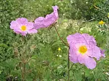 The Cistaceae are a small family of plants (rock-rose or rock rose family) known for their beautiful shrubs, which are profusely covered by flowers at the time of blossom. This family consists of about 170(-200) species in nine genera[2] that are not very distinct, distributed primarily in the temperate areas of Europe and the Mediterranean basin, but also found in North America; a limited number of species are found in South America. Most Cistaceae are subshrubs and low shrubs, and some are herbaceous. They prefer dry and sunny habitats. Cistaceae grow well on poor soils, and many of them are cultivated in gardens.