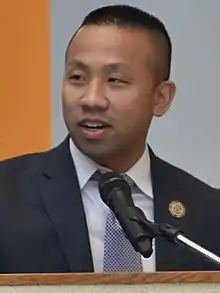 Clarence K. Lam (born November 26, 1980) is an American politician and public health physician. He is a Democratic member of the Maryland Senate from the 12th district who previously served in the Maryland House of Delegates from the 12th district.[1] Lam is a co-chair of the Joint Audit and Evaluation Committee, and is a member of the Joint Committee on Fair Practices & State Personnel Oversight.[2][3] Lam has been an advocate against the practice "lunch shaming" in schools, where elementary school students with unpaid lunch debt are punished by teaching staff. In February 2020, Lam introduced Senate Bill 760 to the Senate, which was designed to ban the practice.[4]