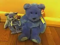 Clubby was a Beanie Baby that was available in 1998 exclusively by mail order to those who joined the Beanie Babies Official Club by purchasing a kit. It was followed up in later years by other bears also named "Clubby" followed by a Roman numeral. In all, a total of ten styles of bears, named Clubby, Clubby II, Clubby III, Clubby IV, Clubby V, Clubby VI (three versions - rainbow colored teddy bear, blue potbelly style bear, and matching purple potbelly style bear), Clubby VII and Clubby VIII. In addition, larger sized Beanie Buddies of Clubby, Clubby II, Clubby III, Clubby IV, Clubby V and Clubby VI (an amalgamation of the three Beanie Baby versions) were produced. A four pack box set of Jingle Beanies (Christmas ornament sized Beanie Babies) containing Clubby, Clubby II, Clubby III and Clubby IV was also released. Although the Clubby bears were not rare, they often proved elusive for people who weren't enrolled in the club, who were forced to search for them on the secondary market or through the Ty Store.