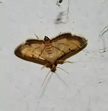 Cnaphalocrocis medinalis, the rice leafroller, is a species of moth of the family Crambidae. It is found in south-east Asia, including Hong Kong, Sri Lanka, Taiwan, Thailand and most of Australia.