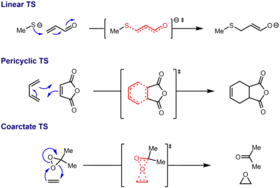 In contrast to these types of reactions, a coarctate reaction is characterized by a doubly cyclic transition state, in which at least one atom undergoes the simultaneous making and breaking of two bonds. Thus, the topology of the transition state of a coarctate reaction is a constricted cycle that meets with itself (resembling a figure eight) while the topology of pericyclic and linear reactions are a circle (or Möbius strip) and line segment, respectively. The concept was first proposed by Herges.[1][2]