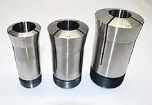 The "ER" collet system, developed and patented by Rego-Fix in 1973, and standardized as DIN 6499, is the most widely used clamping system in the world and today available from many producers worldwide.[7][8] The standard series are: ER-8, ER-11, ER-16, ER-20, ER-25, ER-32, ER-40, and ER-50. The "ER" name came from an existing "E" collet (which were a letter series of names) which Rego-Fix modified and appended "R" for "Rego-Fix". The series number is the opening diameter of the tapered receptacle, in millimetres. ER collets collapse to hold parts up to 1 mm smaller than the nominal collet internal size in most of the series (up to 2 mm smaller in ER-50, and 0.5 mm in smaller sizes) and are available in 1 mm or 0.5 mm steps. Thus a given collet holds any diameter ranging from its nominal size to its 1-mm-smaller collapsed size, and a full set of ER collets in nominal 1 mm steps fits any possible cylindrical diameter within the capacity of the series. With an ER fixture chuck, ER collets may also serve as workholding fixtures for small parts, in addition to their usual application as toolholders with spindle chucks.[9] Although a metric standard, ER collets with internal inch sizes are widely available for convenient use of imperial sized tooling. The spring geometry of the ER collet is well-suited only to cylindrical parts, and not typically applied to square or hexagonal forms like 5C collets.