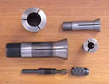 Generally, a collet chuck,[3] considered as a unit, consists of a tapered receiving sleeve (sometimes integral with the machine spindle), the collet proper (usually made of spring steel) which is inserted into the receiving sleeve, and (often) a cap that screws over the collet, clamping it via another taper.