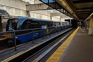 Columbia is an underground station on the Expo Line of Metro Vancouver's SkyTrain rapid transit system. The station is located on Columbia Street in New Westminster, British Columbia, and is a major transfer point between the two branches of the Expo Line, which separate from the main line at the flying junction just east of the station, with one terminating at King George station in Surrey and the other at Production Way–University station in Burnaby.