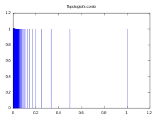In mathematics, particularly topology, a comb space is a particular subspace of that resembles a comb. The comb space has properties that serve as a number of counterexamples. The topologist's sine curve has similar properties to the comb space. The deleted comb space is a variation on the comb space.