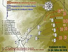 Craufurd committed a serious tactical error by choosing to fight with an unfordable river at his back while badly outnumbered. As such, in the early hours of 24 July, after a night of torrential rain, Ney sent forth Ferey and Loison's divisions to engage the allies.