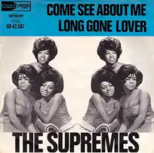 "Come See About Me" was written and produced by Motown's main production team Holland–Dozier–Holland.[4] It was recorded during a two week period in which the Supremes also recorded "Baby Love" after "Where Did Our Love Go" became their most successful single to date.[4] It was the #1 song on the Billboard Hot 100 singles chart for two separate weeks: December 13, 1964, to December 18, 1964, and January 10, 1965, to January 16, 1965, and reached the #3 position on the soul chart.[4] Billboard said that the song has a "pronounced Detroit beat, steady and exacting" and that the "Gals weave silky and controlled vocal through beat."[5] Cash Box described it as "a pulsating stomp-a-rhythmic...that the gals carve out in ultra-commercial manner" and in which the group was "in top-of-the-chart form."[6]