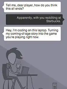 Coming Out Simulator 2014 is an interactive fiction video game made by Canadian developer Nicky Case. The semi-autobiographical game was released on 1 July 2014 as a submission for the Nar8 Game Jam.[1][2]