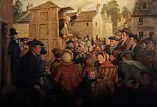 In Scottish presbyterianism, a communion season, sometimes called a holy fair, is an annual week-long festival culminating with the celebration of the Lord's supper (communion). It usually begins with a Thursday fast.[1] On Friday, known as the question day, lay catechists, called "the men", would give their interpretations of Bible verses chosen by the minister.[2] They would occasionally emerge as charismatic leaders of local revivals.[3] A day of preparation would be held on Saturday.[1] The climax was the Sabbath day celebration of communion, often outdoors in a natural amphitheatre.[2] A thanksgiving service would be held on Monday.[1]