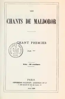 - Les Chants de Maldoror - Chant premier, par *** (1st canto, published anonymously), Imprimerie Balitout, Questroy et Cie, Paris, August 1868