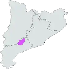 Conca de Barberà is a Spanish Denominación de Origen Protegida (DOP) (Denominació d'Origen Protegida in Catalan) for wines located in central Catalonia in the northern portion of the Tarragona Province. Situated within the river valleys of the Francolí and Anguera, it has historically been known for its white wines, but has been gaining more attention for its reds, especially those from the native Trepat grape.[2] Today, the Conca de Barberà DOP mainly produces red wines, along with whites, and minor amounts of rosés and sparkling wines.