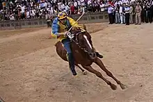 In August 1938, after the dissolution of the "T.O.N.O.," the rivalry between Chiocciola and Tartuca was enriched by a new chapter: the Tartuca was widely favored thanks to the jockey Ganascia on the horse Ruello, whereas the Chiocciola presented itself with Tripolino on the modest race horse Sansano.[26] Against all odds the Chiocciola won after a twelve-year abstinence. A black crisis opened in the Tartuca: the idol Ganascia was harshly challenged by the Tartuca members, guilty of having done little to prevent the rival's victory. The seemingly inseparable relationship between the jockey and the contrada of Castelvecchio was thus interrupted.[30] On July 2, 1949, the Tartuca was still among the favorites, with Ciancone on the strong horse Piero. The Chiocciola came to the starting block with Eletto Alessandri known as Bazza, on the "brenna"[note 21] Lirio.[26] Surprisingly, as eleven years earlier, it was the Chiocciola that won, mocking the favored Tartuca.