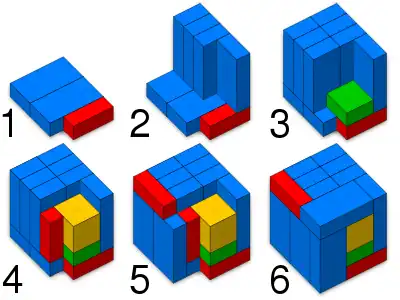 Conway's puzzle, or blocks-in-a-box, is a packing problem using rectangular blocks, named after its inventor, mathematician John Conway. It calls for packing thirteen 1 × 2 × 4 blocks, one 2 × 2 × 2 block, one 1 × 2 × 2 block, and three 1 × 1 × 3 blocks into a 5 × 5 × 5 box.[1]