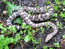 P. guttatus was previously placed in the genus Elaphe, but Elaphe was found to be paraphyletic by Utiger et al., leading to placement of this species in the genus Pantherophis.[20] The placement of P. guttatus and several related species in Pantherophis rather than in Elaphe has been confirmed by further phylogenetic studies.[21][22] Many reference materials still use the synonym Elaphe guttata.[23] Molecular data have shown that the corn snake is actually more closely related to kingsnakes (genus Lampropeltis) than it is to the Old World rat snakes (genus Elaphe) with which it was formerly classified. The corn snake has even been bred in captivity with the California kingsnake (Lampropeltis californiae) to produce fertile hybrids known as "jungle corn snakes".[24]