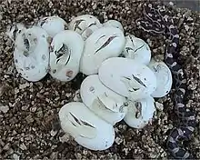 Egg-laying occurs slightly more than a month after mating, with 12–24 eggs deposited into a warm, moist, hidden location. Once laid, the adult snake abandons the eggs and does not return to them. The eggs are oblong with leathery, flexible shells. About 10 weeks after laying, the young snakes use a specialized scale called an egg tooth to slice slits in the egg shell, from which they emerge at about 5 in (13 cm) long.[32]