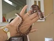 The corn snake (Pantherophis guttatus), sometimes called red rat snake, is a species of North American rat snake in the family Colubridae. The species subdues its small prey by constriction.[4][5] It is found throughout the southeastern and central United States. Though superficially resembling the venomous copperhead (Agkistrodon contortrix) and often killed as a result of this mistaken identity, the corn snake lacks functional venom and is harmless. The corn snake is beneficial to humans[6] because it helps to control populations of wild rodent pests that damage crops and spread disease.[7]