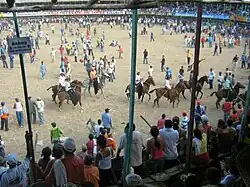 A corraleja is a bullfighting festival in the Caribbean region of Colombia. In this type of event, the public is invited to engage the bulls in the ring. Compared a Spanish-style bullfight, the bulls are not killed after the fight, and the event is much less formal.[1]
