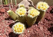 Coryphantha (from Greek, "flowering on the top"), or beehive cactus, is a genus of small to middle-sized, globose or columnar cacti. The genus is native to arid parts of Central America, Mexico, through Arizona, New Mexico, and western Texas and north into southwestern, central, and southeastern Montana. With its two subgenera, 57 species and 20 subspecies, it is one of the largest genera of cactus.[1]