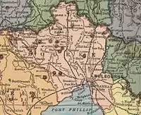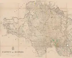 The "Melbourne and County of Bourke Police" was the name for the police force in the area before 1853. The County of Bourke was used on the name of the electoral roll in 1845.[2] There was also the "Bourke County Court" in the 1850s,[3] which became the County Court of Victoria. Melbourne is also referenced as being in "Bourke county" in the Encyclopædia Britannica Eleventh Edition.[4]