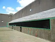 Three walls feature sloping wooden roofs, known as penthouses, built 2 to 2.2 metres (6 ft 7 in to 7 ft 3 in) above the floor and extending to a width of 1.6 to 2.2 metres (5 ft 3 in to 7 ft 3 in). The wall without a penthouse is called the main wall. Protruding from the main wall is the tambour, an angled wall 0.7 to 1.0 metre (2 ft 4 in to 3 ft 3 in) wide at an angle of approximately 53 degrees, though some courts can be up to 59 degrees.[8]
