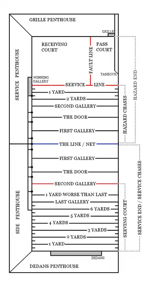 Counting clockwise from the main wall, the penthouse are called the dedans penthouse, the service penthouse and the grille penthouse. The side featuring the dedans penthouse is also known as the service end, and the side featuring the grille penthouse is also known as the hazard end. Beneath the penthouses are various openings in the wall, which have various mechanics in the gameplay and allow spectators to view the game. Underneath the dedans penthouse is the dedans, between 5.7 and 6.7 metres (19 and 22 ft) wide positioned centrally along the wall. A net across the opening allows spectators to view the game without fear of injury. Beneath the grille penthouse is the grille, a roughly square opening measuring between 0.9 by 0.9 metres (2 ft 11 in × 2 ft 11 in) and 1.0 by 1.0 metre (3 ft 3 in × 3 ft 3 in) positioned the upper right hand side as viewed from the court. The grille is generally blocked by a solid wood cover and features a picture or club logo, though American courts generally have netting instead. Beneath the service penthouse is a long opening, divided up into smaller openings by wooden or metal posts. The central such opening, known as the line, extends to the floor and allows players to enter the court and change ends. Counted from the centre of the court, the openings are known symmetrically as first gallery, the door, second gallery and last gallery, though at the end of the court closet to the grille penthouse the final opening is instead called the winning gallery and contains a bell which rings when a ball enters the opening.[9]