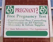 A crisis pregnancy center (CPC), sometimes called a pregnancy resource center (PRC)[2] or a pro-life pregnancy center,[3][4] is a type of nonprofit organization established by anti-abortion groups primarily to persuade pregnant women against having an abortion.[5][6][7]: 1 In the United States, CPCs that qualify as medical clinics may also provide pregnancy testing, sonograms, and other services,[8] while many others operate without medical licensing under varying degrees of regulation.[9]
